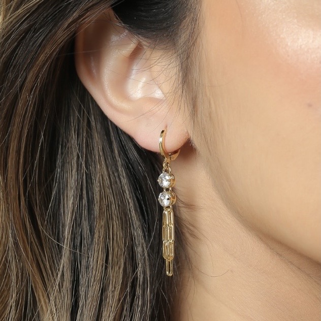 Eleve o seu estilo com este deslumbrante par de brincos, uma adição encantadora à sua coleção de joias. Cada peça é cuidadosamente confeccionada com 2 zircônias, criando um visual elegante e sofisticado.