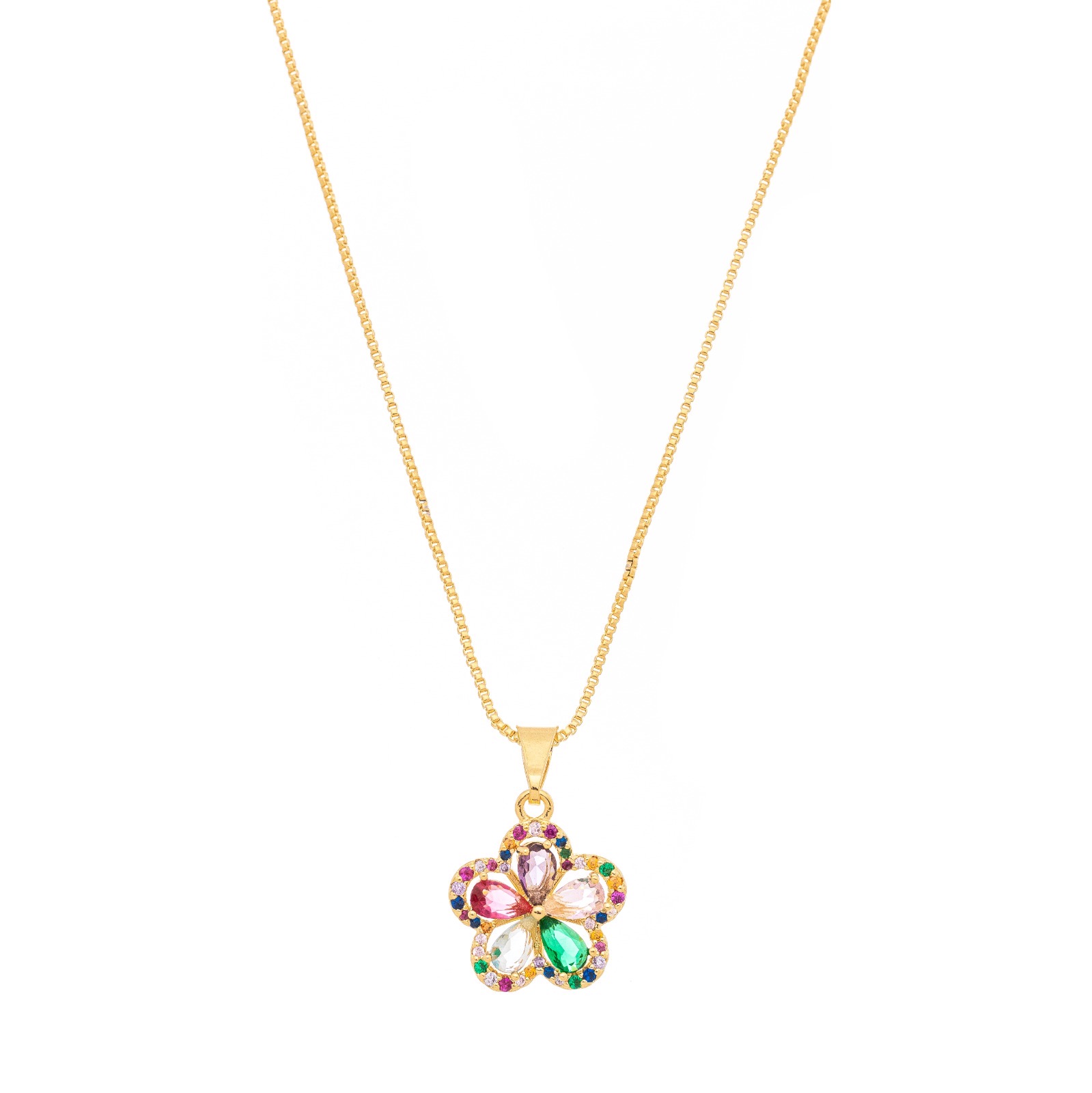 Deixe-se encantar pela beleza e pela delicadeza deste adorável colar em forma de flor, ornamentados com zircônias coloridas. Cada detalhe deste colar foi meticulosamente trabalhado para criar uma peça encantadora que combina charme e elegância de forma sublime.