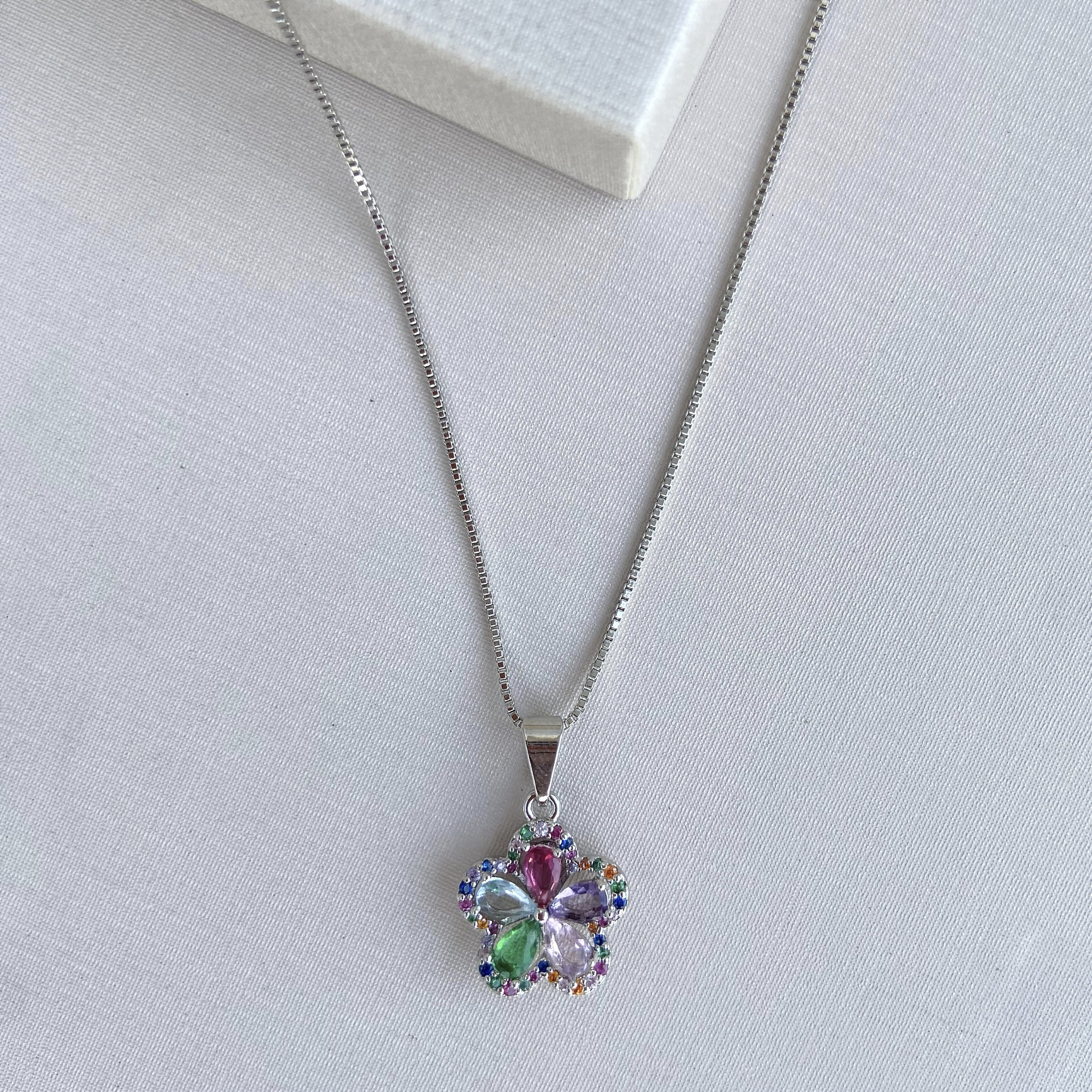 Deixe-se encantar pela beleza e pela delicadeza deste adorável colar em forma de flor, ornamentados com zircônias coloridas. Cada detalhe deste colar foi meticulosamente trabalhado para criar uma peça encantadora que combina charme e elegância de forma sublime.