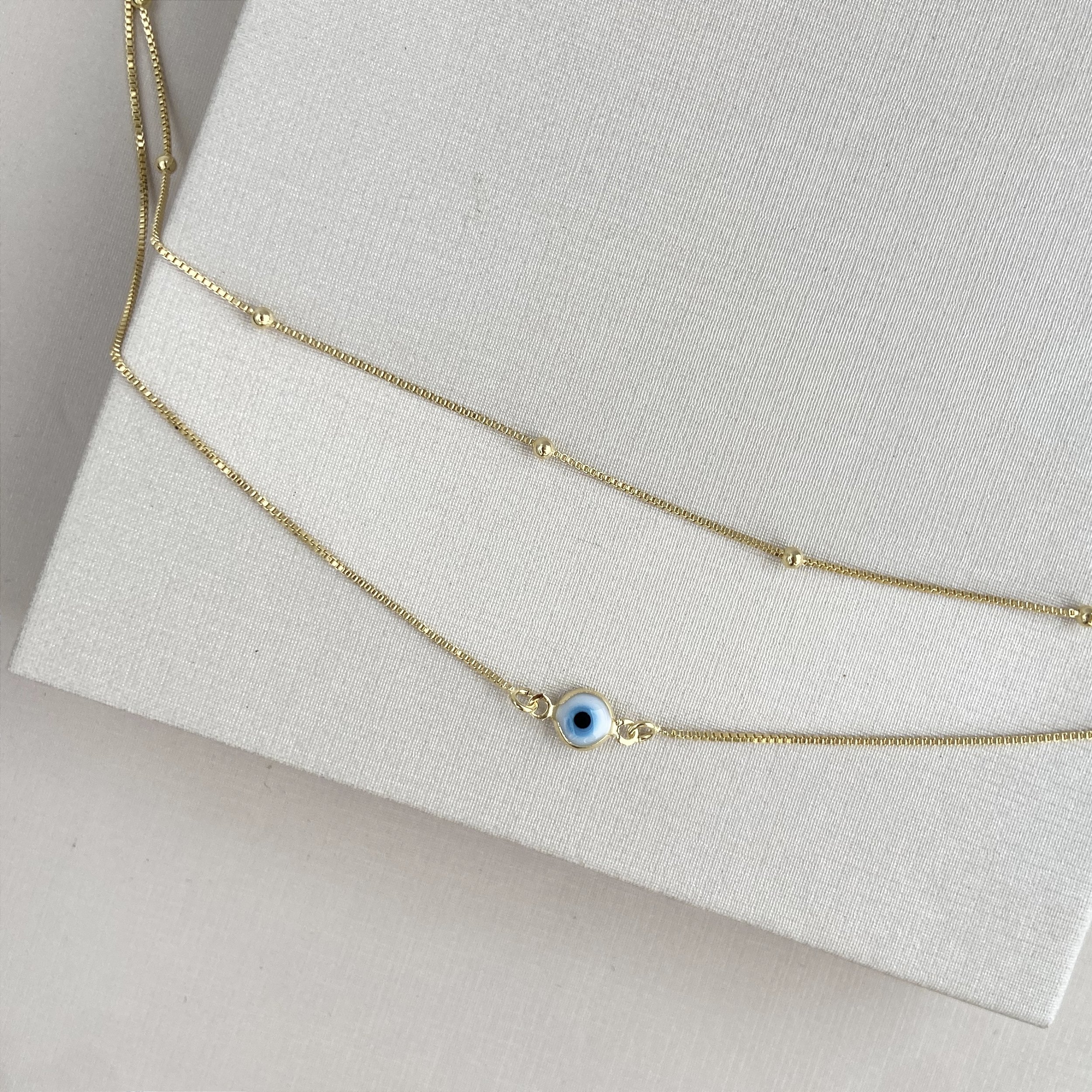 A tornozeleira dupla olho grego possui banho de ouro 18k que confere um brilho luxuoso a peça, proporcionando um acabamento duradouro e deslumbrante. Seu design versátil e atemporal as torna adequadas para o dia a dia.